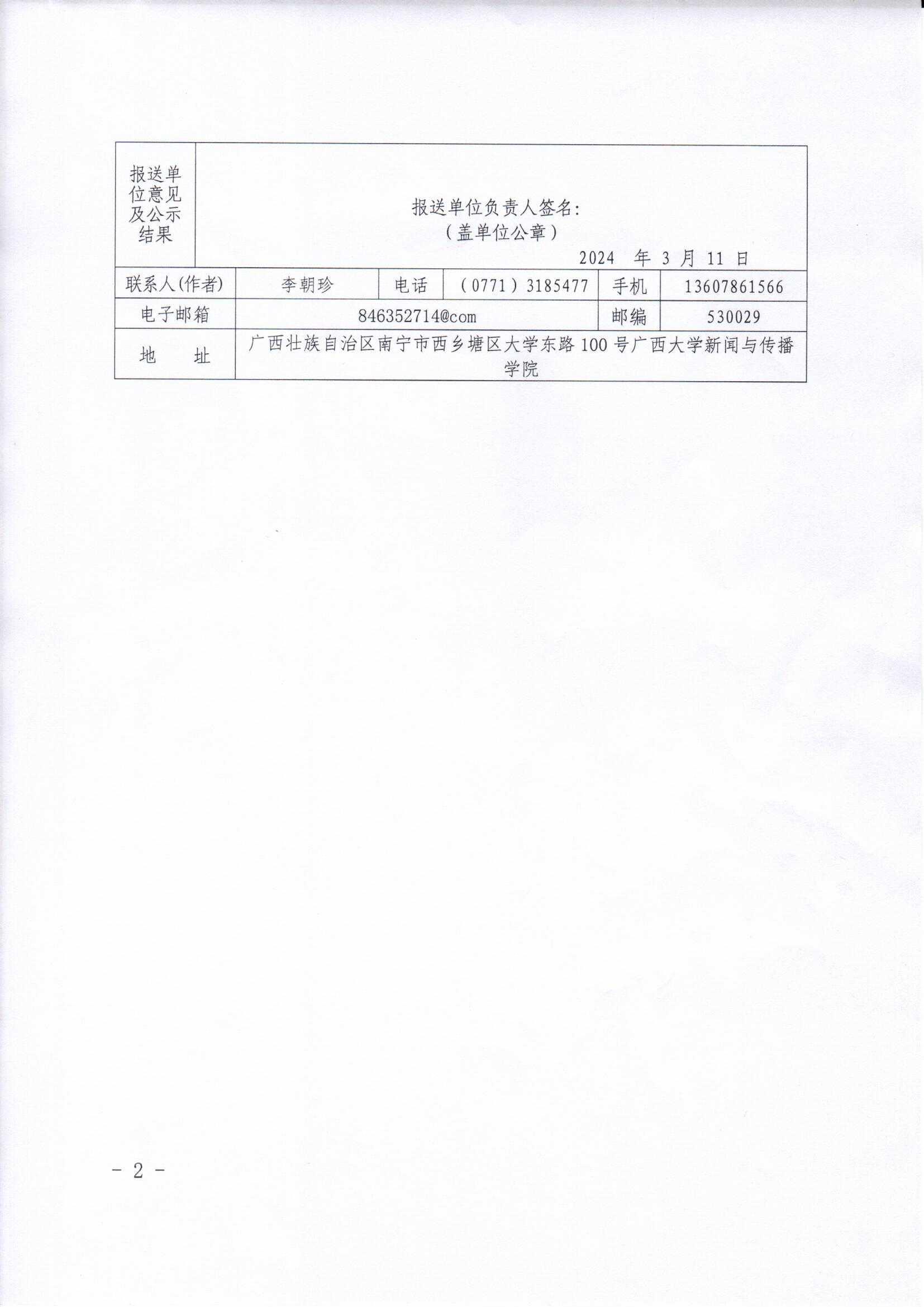 根据广西壮族自治区广播电视局、广西广电与网络视听协会发布的《关于2023年度广西广播电视和网络视听优秀作品推选报送工作的通知》(桂广发[2024]11号),现将我院参与报送的3份作品予以公示(作品内容详见附件)。公示时间:2024年3月11日至2024年3月15日。
