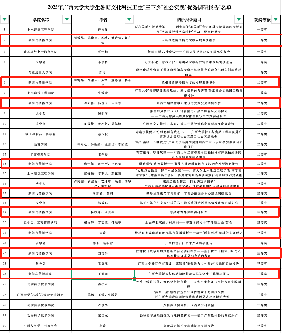 《大新县边境传播与文旅发展调研报告》获评“优秀调研报告”一等奖、《龙州县边境传播与文旅发展调研报告》《靖西市融媒体中心建设与文旅发展调研报告》《媒旅融合 边关共振一一那坡县县级融媒体与文旅融合发展调研报告》获评“优秀调研报告”二等奖、《基层治理视角下凭祥市、宁明县融媒体中心建设调研报告》《东兴市对外传播调研报告》《桂林抗日战争时期红色新闻活动调研报告--基于救亡日报社旧址与八路军桂林办事处纪念馆的考察》《桂林抗日战争时期红色新闻活动调研报告--基于救亡日报社旧址与八路军桂林办事处纪念馆的考察》《伟德betvlctor1946源于英国赴凌云县选调生工作调研报告》获评“优秀调研报告”三等奖,获评数量和占比均为全校第一。