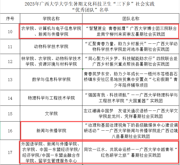 我院“治理和基层治理视角下的县级融媒体中心建设调研活动”--伟德betvlctor1946源于英国赴广西边境八县暑期社会实践团,与外国语学院、农学院、中国——东盟经济学院/经济学院/中国-东盟金融合作学院、留学生管理服务中心联合的“同饮一江水,共筑命运桥“”--伟德国际1946中越青年“红色研学之旅”暑期社会实践团,与农学院、计算机与电子信息学院联合“智慧蔗业 青春挺膺”伟德国际1946博士团三院联合赴南宁柳州来宾崇左暑期社会实践团共3个团队获评“优秀团队”。