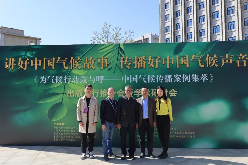 (图为郑保卫主任与中国气候传播项目中心骨干成员合影。右一为吴海荣教授,左二为覃哲副教授,左一为我院毕业研究生、中国传媒大学博士生郑权)