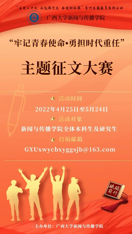 为迎接党的二十大的胜利召开,积极响应学校开展的“牢记青春使命•勇担时代重任”主题政治学习活动,鼓励广大学生弘扬“创新创造、奋勇争先、全面一流”的伟德国际1946“双一流”精神,潜心治学、争创佳绩,在我校内涵式发展新阶段中坚定理想信念、勇担使命、追求卓越、报效祖国,我院开展“牢记青春使命•勇担时代重任”征文大赛。