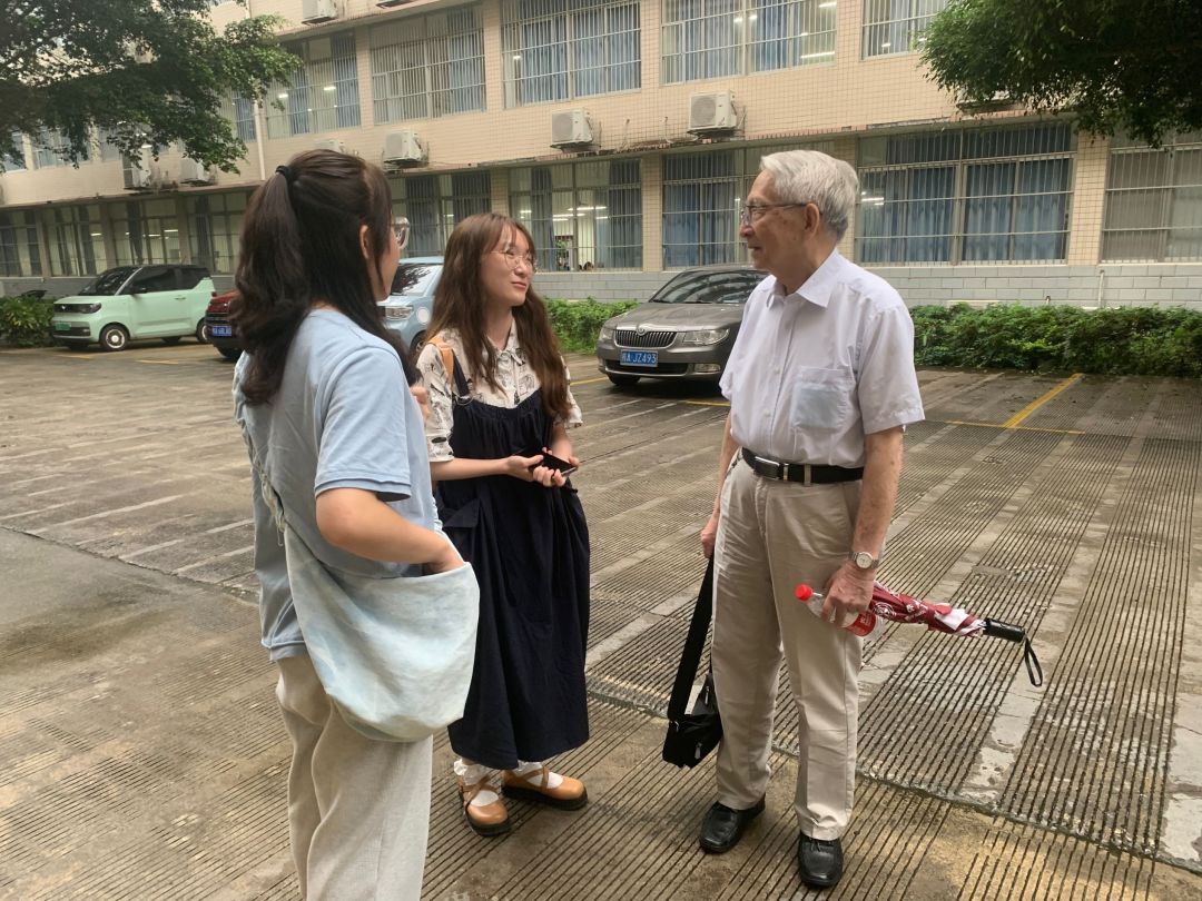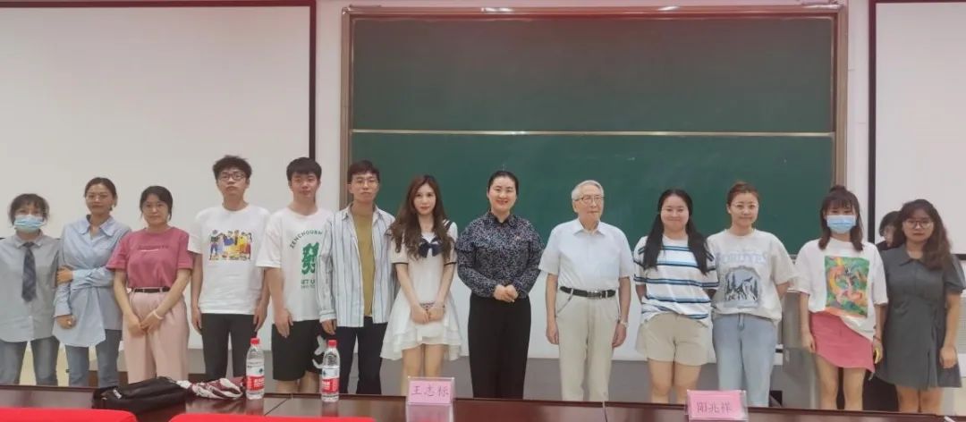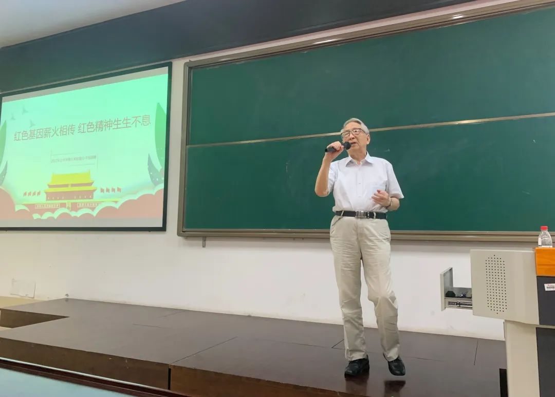 随后,物理学院退休老共产党员阳兆祥教授与同学们分享了他和共和国一起成长的人生经历,使在座的同学深受鼓舞和启发。他首先借用了毛泽东访问苏联时在莫斯科大学接见中国留学生时发表的著名演讲:“世界是你们的,也是我们的,但是归根结底是你们的。你们青年人朝气蓬勃,好像早晨八九点钟的太阳。希望寄托在你们身上。”以此表达对年轻一代的期望。