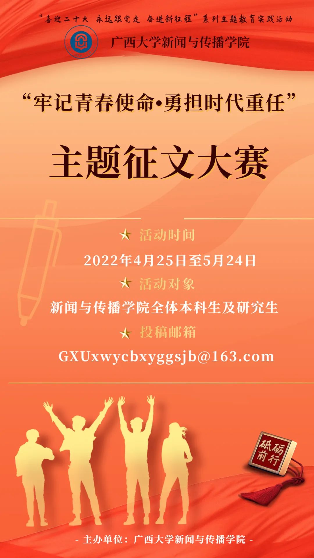 为迎接党的二十大的胜利召开,积极响应学校开展的“牢记青春使命•勇担时代重任”主题政治学习活动,鼓励广大学生弘扬“创新创造、奋勇争先、全面一流”的伟德国际1946“双一流”精神,潜心治学、争创佳绩,在我校内涵式发展新阶段中坚定理想信念、勇担使命、追求卓越、报效祖国,我院决定开展“牢记青春使命•勇担时代重任”征文大赛。