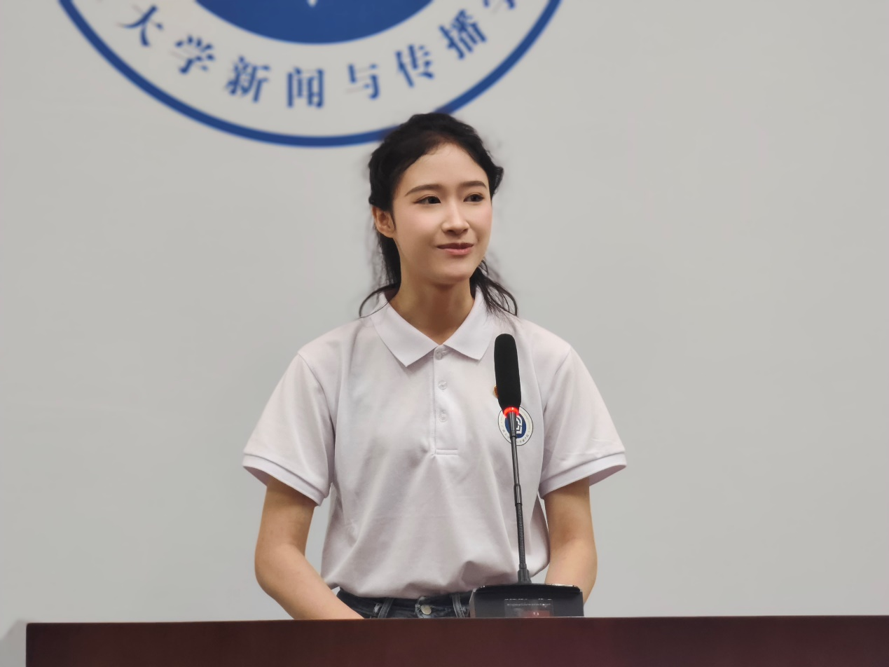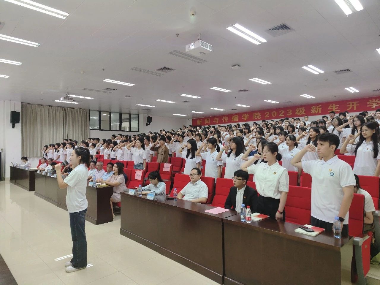 典礼开场,本科生新生代表播音与主持专业播音231班吴英娇发言,她表示,她的新闻理想是让无力者有力,为无声者发声,通过流畅而有力的语言,争做优秀新闻工作者,传递正能量,并希望能够在大学生活中不断探索、不断体验,用不怕输的自信与勇气去迎接每一个新挑战,释放青春热血。