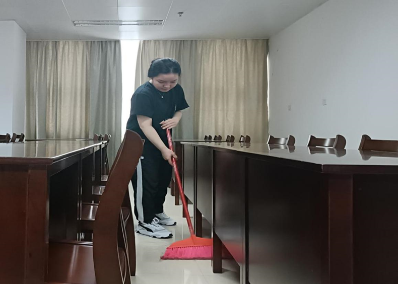 清扫过程中,志愿者们手持扫把、撮箕、抹布,认真清扫地面上的垃圾,擦拭课桌椅上的灰尘,不放过任何一处细节、角落。