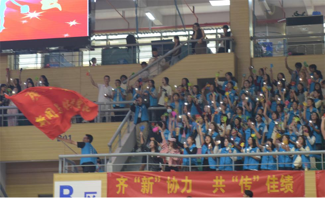 我院的啦啦队早早来到观众席给参赛运动员们加油助威。他们身穿蓝色新传马甲,挥动拍手器和手机手电筒,为参赛运动员们营造热情气氛。我院院旗随响亮而富有节奏感的鼓声舞动,啦啦队热情饱满地呐喊道:“精彩新闻,无限传播!”