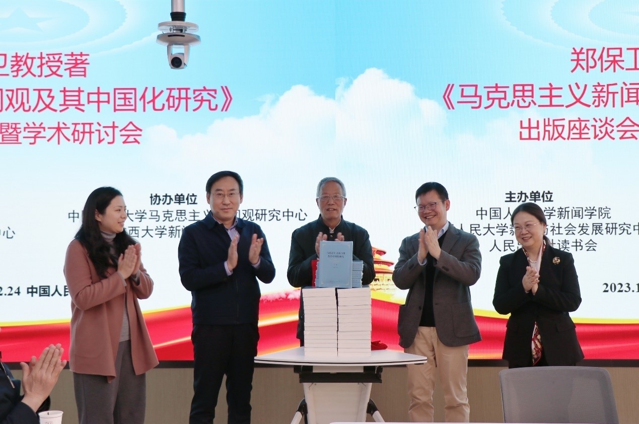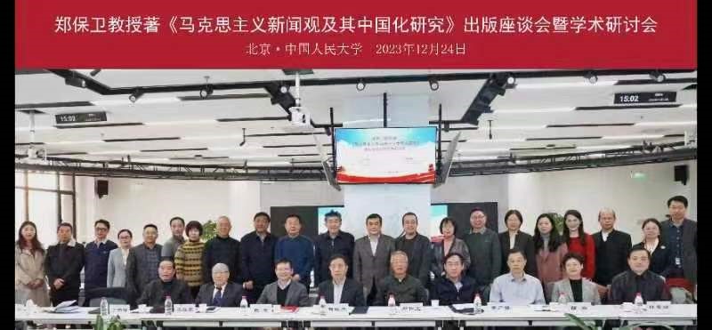 在毛泽东诞辰130周年之际,为深入学习贯彻习近平文化思想和全国宣传思想文化工作会议精神,深化马克思主义新闻观及其中国化时代化研究,由中国人民大学新闻学院、中国人民大学新闻与社会发展研究中心和人民出版社读书会主办,中国人民大学马克思主义新闻观研究中心和伟德betvlctor1946源于英国协办的《郑保卫教授著〈马克思主义新闻观及其中国化研究〉出版座谈会暨学术研讨会》,于12月24日下午在中国人民大学明德新闻楼举行。来自书稿出版单位的领导,以及政府部门、高校、媒体等单位的50余位领导、专家和学者参加了会议。