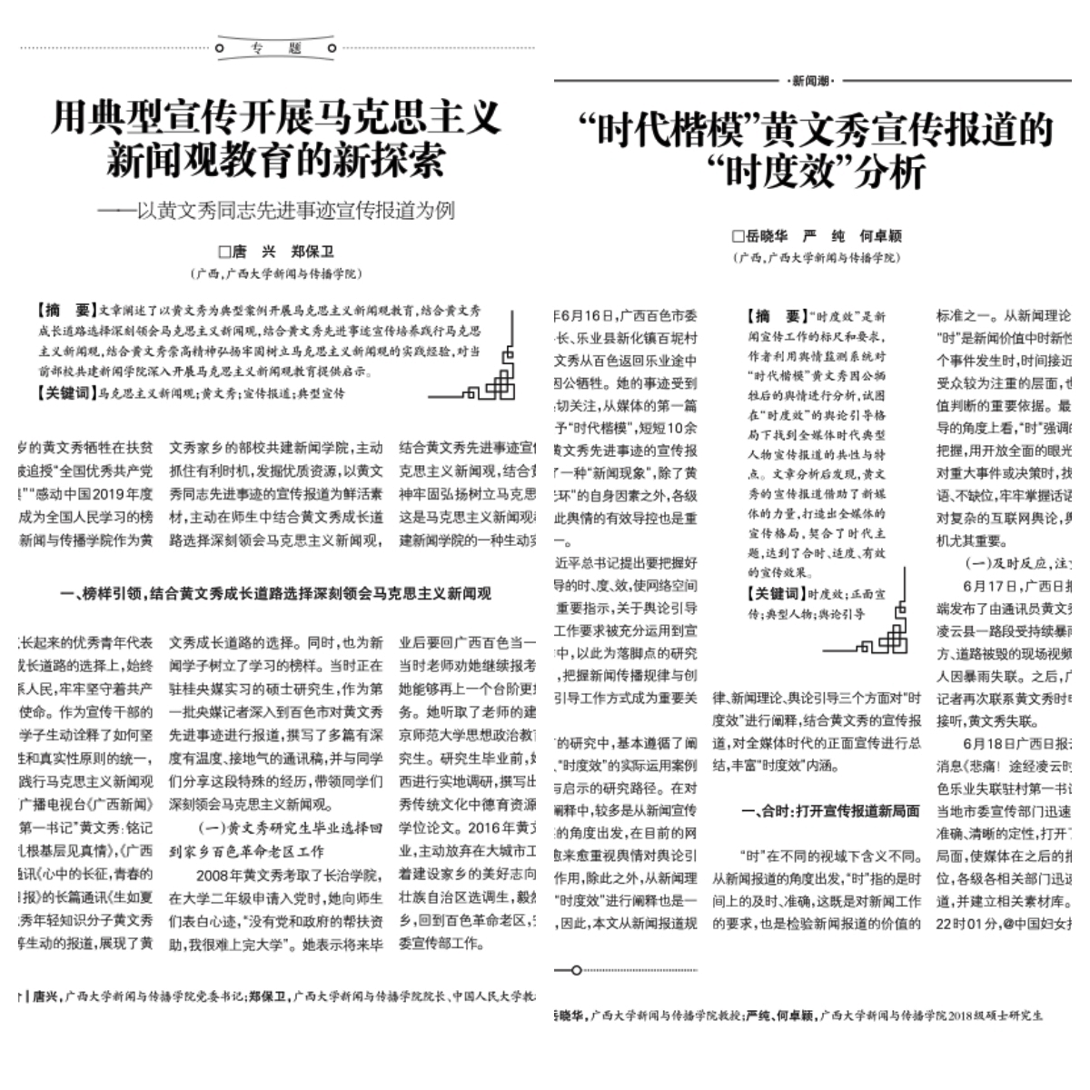 在理论研究方面,学院师生以黄文秀先进事迹宣传报道为研究对象,撰写并发表《“时代楷模”黄文秀宣传报道的“时度效”分析》《用典型宣传开展马克思主义新闻观教育的新探索—以黄文秀同志先进事迹宣传报道为例》等多篇学术论文。在网络舆情研究方面,学院组织广西舆情研究中心的师生撰写了《“时代楷模”黄文秀先进事迹宣传报道舆情专报》,并提供给自治区党委宣传部。