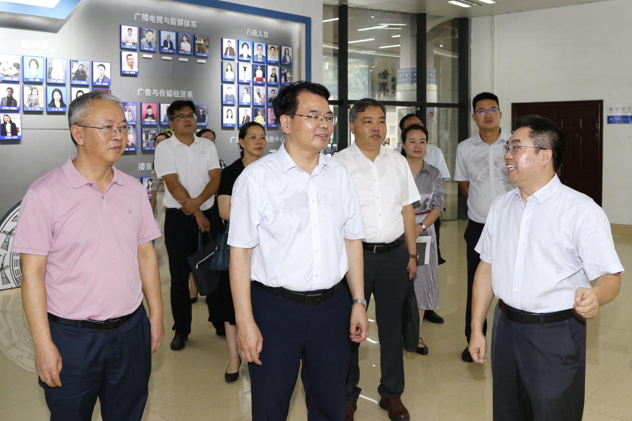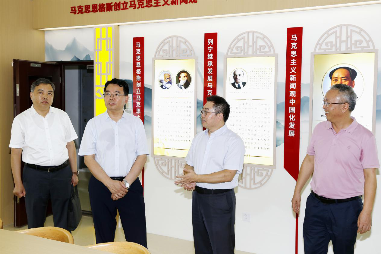 调研期间,李国忠书记一行还深入了解学院部校共建成果,实地考察了全国第一家高校马克思主义新闻观书屋、融媒体中心、全媒体交互式演播中心。李国忠书记对学院部校共建所取得的显著成绩给予了高度评价,并强调新闻学院要持续深化产教融合、校企合作,不断创新人才培养模式,为培养更多符合时代需求的高素质新闻传播人才作出更大贡献。