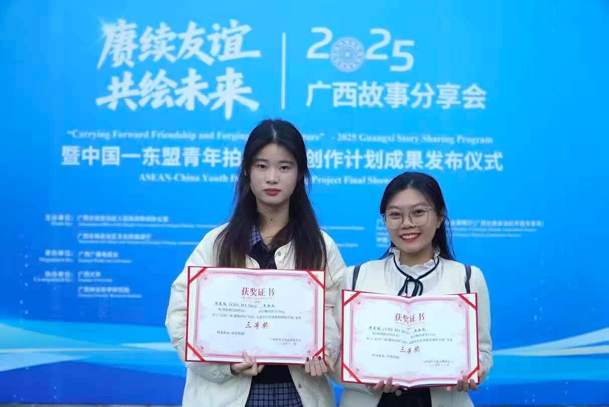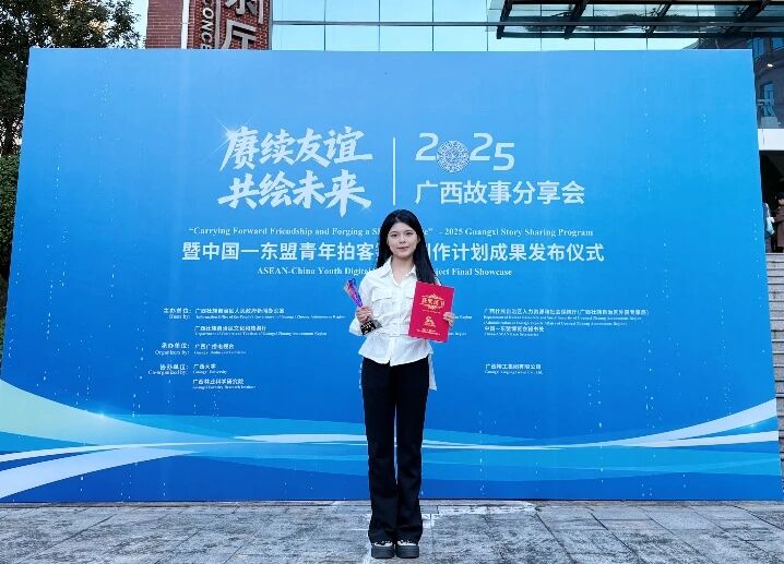 11月20日,“赓续友谊 共绘未来”2025广西故事分享会暨中国—东盟青年拍客数智创作计划成果发布仪式在南宁举行。我院学子不负众望,凭借扎实的专业功底与创新的创作理念,在本次自治区级重要赛事中斩获5项奖项,其中一等奖1项、二等奖1项、三等奖2项、优秀奖1项。