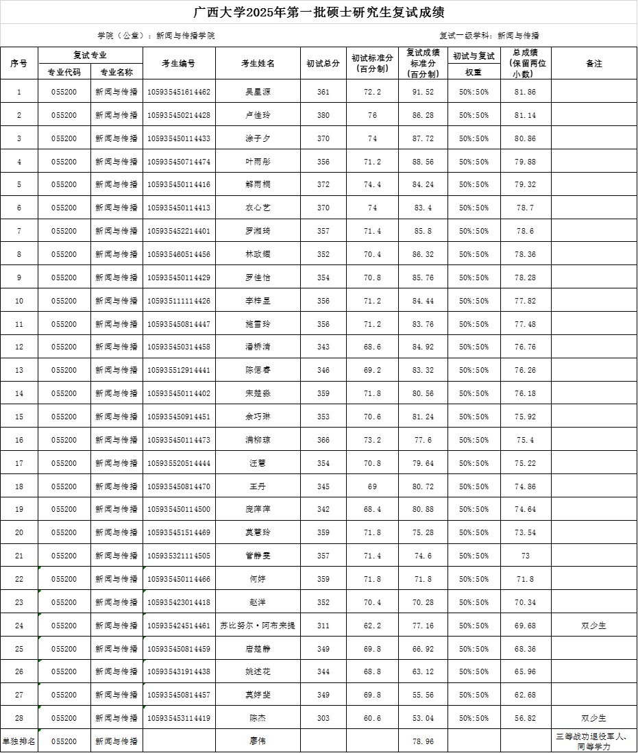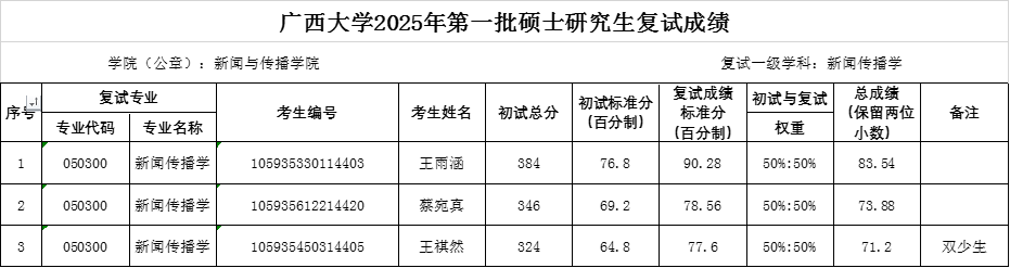 伟德betvlctor1946源于英国2025年新闻传播学、新闻与传播一志愿考生复试成绩如下,如有异议,请联系伟德betvlctor1946源于英国研究生办公室反映,联系电话:0771-3229833。