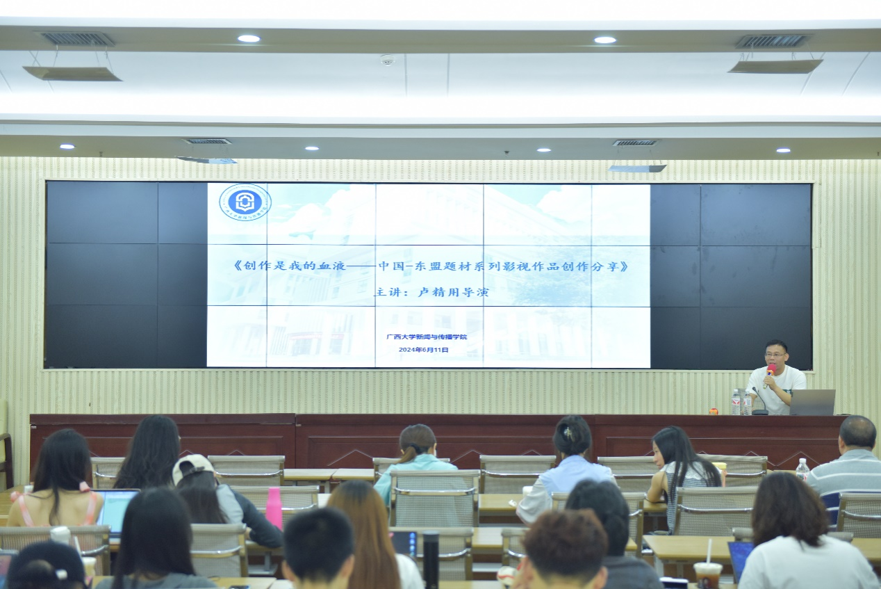 “创作融入了我的生活和我的工作,我的身体里注入了创作的血液。”卢精用导演在讲座中结合代表作品,分享“为什么做东盟”、“怎么创作”、“AI时代,创作者何去何从”三个部分内容。 首先,他说明自己做东盟创作主题的初衷、规划和可能性,表明创作是一个漫长的过程,需要一步一个脚印地翻过这座山,让世界看见“我”。 其次,卢精用导演从“着小小点,创新突围”和“文化差异,情感共鸣”两方面入手,讲述创作的方法和技巧,把他导演的作品作为范本,生动展现了这些知识的应用。 最后,卢精用导演提到了AI创作问题,倡导同学们拥抱互联网,巧用AI,顺应时代发展的潮流,让技术服务于创作。