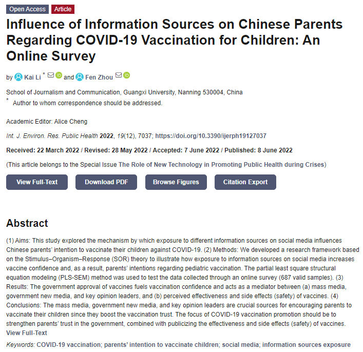 李凯博士及其硕士研究生周芬在国际期刊《International Journal of Environmental Research and Public Health》上发表学术论文《Influence of Information Sources on Chinese Parents Regarding COVID-19 Vaccination for Children: An Online Survey》( https://doi.org/10.3390/ijerph19127037)。该论文为李凯博士主持的国家社科基金青年项目(项目号:20CXW012)阶段性研究成果。