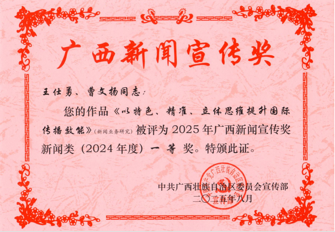 其中,王仕勇、曹文扬撰写的发表在《新闻战线》上的新闻业务研究论文《以特色、精准、立体思维提升国际传播效能》,被评为2025年广西新闻宣传奖新闻奖(2024年度)一等奖。文章提出,在面向东盟的国际传播中,广西具有地理区位、民俗文化、人文往来等特殊性,被赋予国际传播的重要使命。需以特色、精准、立体思维提升面向东盟的国际传播效能,实现从“大众”到“特色”的本土化传播,做好从“泛化”到“精准”的浸润式传播,构建由“平面”到“立体”的现代化全媒体传播格局,推进中国与东盟国家共同体建设。