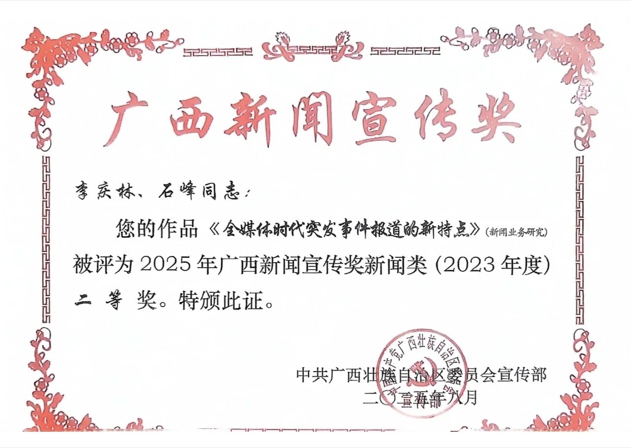 李庆林、石峰撰写的发表在《中国记者》上的新闻业务研究论文《全媒体时代突发事件报道的新特点》,被评为2025年广西新闻宣传奖新闻奖(2023年度)二等奖。文章分析了全媒体环境下突发事件报道呈现的新特点:线索来源高度依赖社交媒体,记者需具备快速核实与响应能力;报道需兼顾全面性与问题导向,主动回应公众疑虑;多媒介适配要求记者掌握直播、短视频等多形态报道方式;强调受众“在场”体验,对记者临场应变及人文关怀能力提出更高要求;需平衡时效与真实性,强化信息确证;危机与健康传播功能凸显,体现媒体社会责任。全媒体时代要求记者具备综合素养以适应传播生态变革。