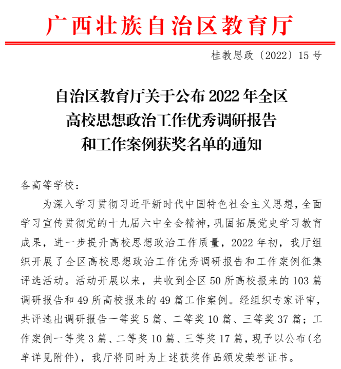 在2022年全区高校思想政治工作优秀调研报告和优秀工作案例征集中,我院银健、雷圆媛、唐兴老师申报的“锤炼‘四力’,在实践育人中践行马克思主义新闻观”获得优秀工作案例二等奖。