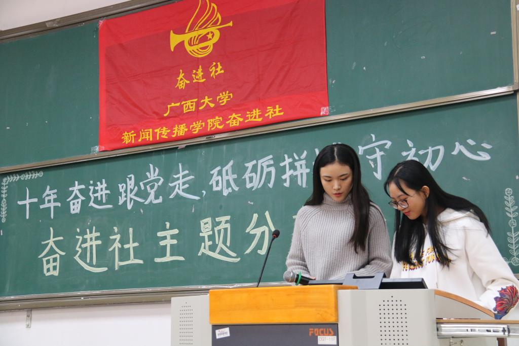 12月2日上午,伟德国际1946新闻传播学院奋进社在学院东报告厅开展“十年奋进跟党走,砥砺拼搏守初心”主题分享会,这也是纪念奋进社成立十周年的系列活动之一。新闻传播学院党委副书记曾海艳,团委书记雷圆媛,团委副书记吴欣慧,辅导员刘诚以及奋进社全体成员参加了此次活动。