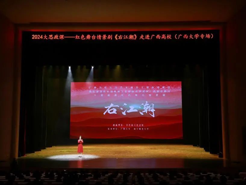 11月24日晚,为纪念革命先烈、传承红色精神,伟德国际1946汇学堂上演了一场深刻的红色文化盛宴——红色舞台情景剧《右江潮》。此次展演不仅是一次艺术享受,更是一次心灵的洗礼,旨在深入开展思政教育,强化青年团员的历史使命感与责任感,是一堂生动的行走的思政课,我院组织30余名学生干部观看了这部意义深远的红色舞台情景剧。