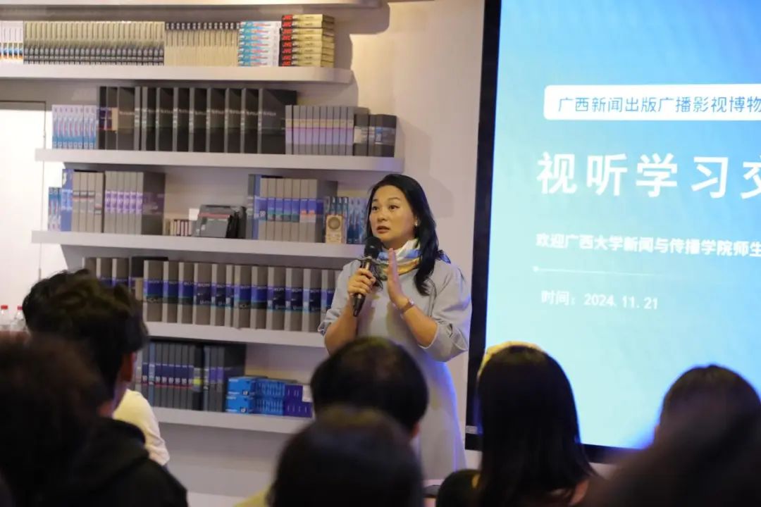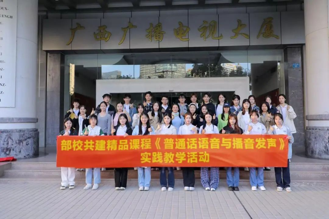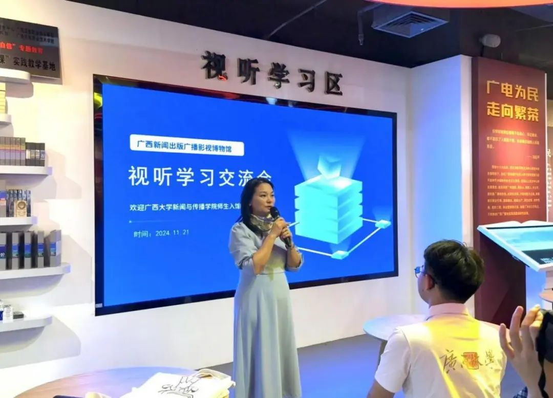 2024年11月21日,在伟德betvlctor1946源于英国部校共建精品课程《普通话语音与播音发声》课程负责人李朝珍教授的带领下,播音与主持艺术专业2023级、2024级本科生,前往广西新闻出版广播影视博物馆进行校外创新实践教学活动。