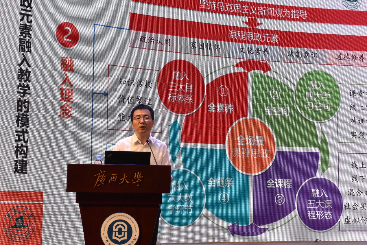 在思政元素融入教学的模式构建这个主题,刘涛教授展示了自己马克思主义新闻观融入教学模式构建设计,分享自己的设计思路和融入理念。他表示,新闻传播类课程的课程思政应坚持以马克思主义新闻观为指导,实现思政元素全素养、全空间、全课程、全链条、全场景融合。