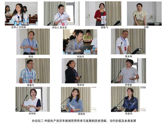 在接下来举行的分论坛上,数十名专家、学者展示了自己的研究成果,展开了深入的交流研讨。分论坛的议题包括“中国共产党百年新闻事业形成与发展的历史进程及实践经验”“中国共产党百年新闻思想传承与发展的历史贡献、当代价值及未来发展”“马克思主义新闻观中国化百年演进与发展的理论价值及实践意义”“百年中国共产党新闻政策变迁与发展”“新闻学术期刊的政治担当与学术品质”五个方面,讨论内容涉及中国共产党新闻事业的发展历程与伟大成就、中国特色社会主义新闻学学科建设与发展、中国共产党百年新闻实践、马克思主义新闻观及其中国化等。