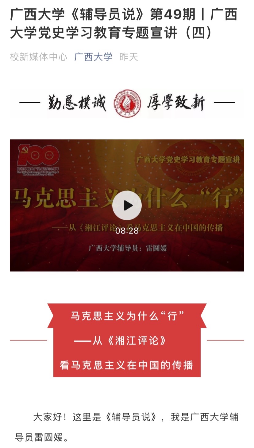 学院播音主持艺术专业教授发挥专业特长,在学院融媒体中心里倾情讲述《一艘红船忆初心,革命精神永铭记》的党史故事,以声传情、声入人心;学院辅导员录制“辅导员说”——《从湘江评论看马克思主义在中国的传播》,化身“主播”,以微宣讲的方式,用学生感兴趣的话语讲述党史;学院利用校园广播,开设《党史上的今天》、《党史故事》专栏每天播出,从3月21日开播到2021年7月1日共播出100期和100个党史故事。在学院微博上设置话题#学原著、读原文、悟原理#,点击量达到130多万次,同学们以“云读书”的方式“讲述”读书心得,评论达到五千多条。组织师生到扶贫点、到红色教育基地“打卡”,学院赴红军长征湘江战役实践队获评2020年广西大中专学生志愿者暑期文化科技卫生“三下乡”社会实践活动“优秀团队”。