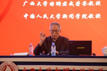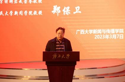 讲座由院长王仕勇主持。王院长说,2017年郑保卫教授担任学院院长以来,带领西大新传人主动服务广西经济社会发展和国家总体战略,扎实开展教书育人工作和学科建设工作,近五年获批国家社科基金重大项目、重点项目、一般项目等11项,学院在马克思主义新闻观、民族文化传播、气候与健康传播、中国-东盟区域传播等领域凸显特色。王院长介绍,“达文大讲堂”,是学院计划建成的品牌性学术活动,旨在致敬历史、筑梦未来,进一步浓厚学术氛围,凝练学科方向,产出优秀成果。