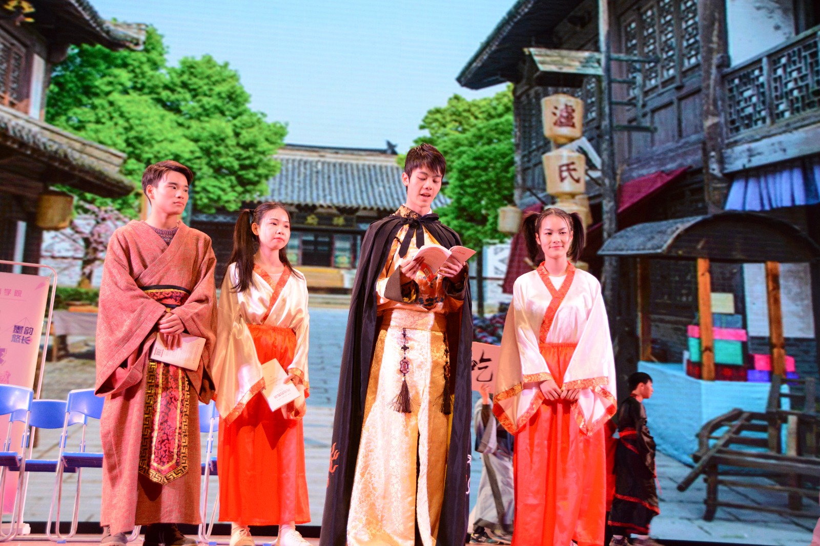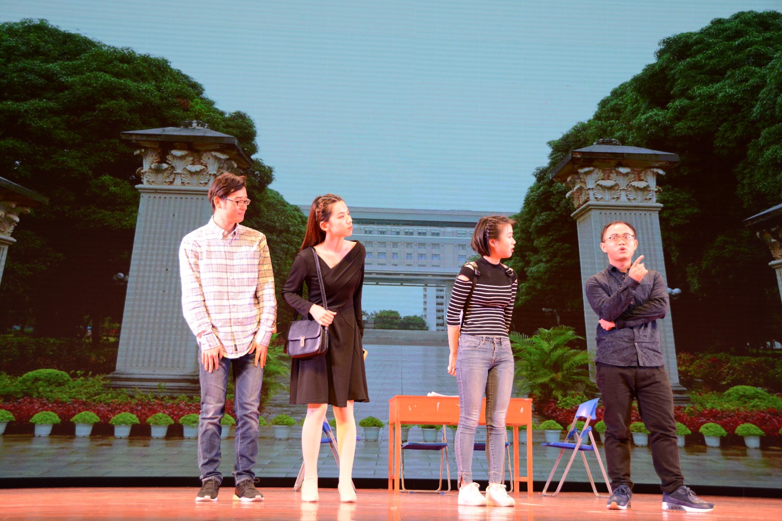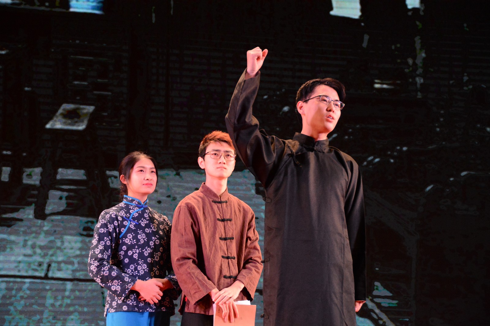 晚会开始,学院舞蹈队用开场舞《HOLIODAY》为今晚的读书晚会拉开了序幕。充满活力的舞蹈将全场气氛带动起来。在第一篇章“书载千秋”,新闻172班用情景剧《党光辉下的一家人》讲述了几代人在党带领下创造幸福生活的故事。随后,17级专硕班的同学架起古筝,换上带有民族特色的服装,“十里桃,八桂情”,展示出不一样的青春风采。“五花马,千金裘。呼儿将出换美酒,与尔通销万古愁!”激昂的朗诵,一声声震撼着同学们的心。配合着灵动的音乐,新闻174班的同学们和武术协会为大家带来了武术操和诗朗诵《武之力,声之形》。